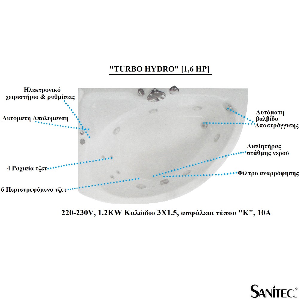 1) Υδρομασάζ με 6 περιστρεφόμενα τζετ ON/OFF & επιπλέον 2 τζετ πλάτης