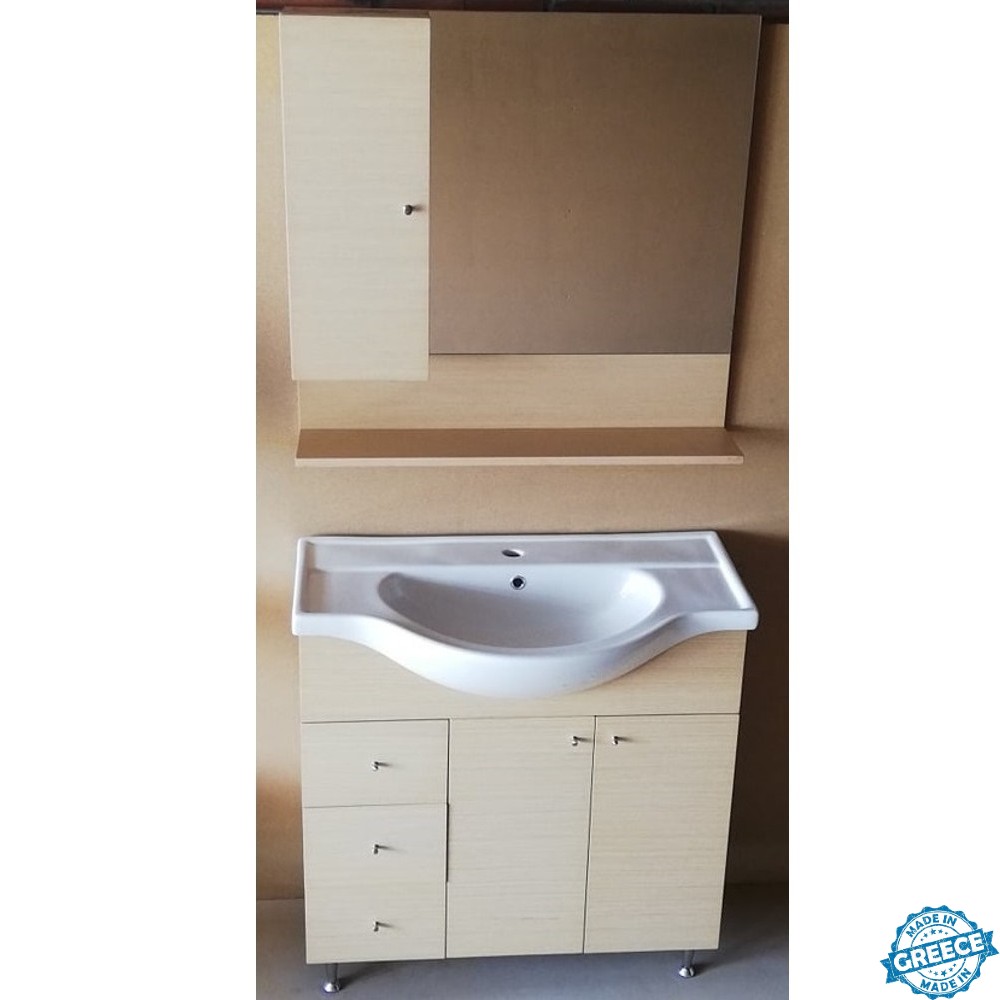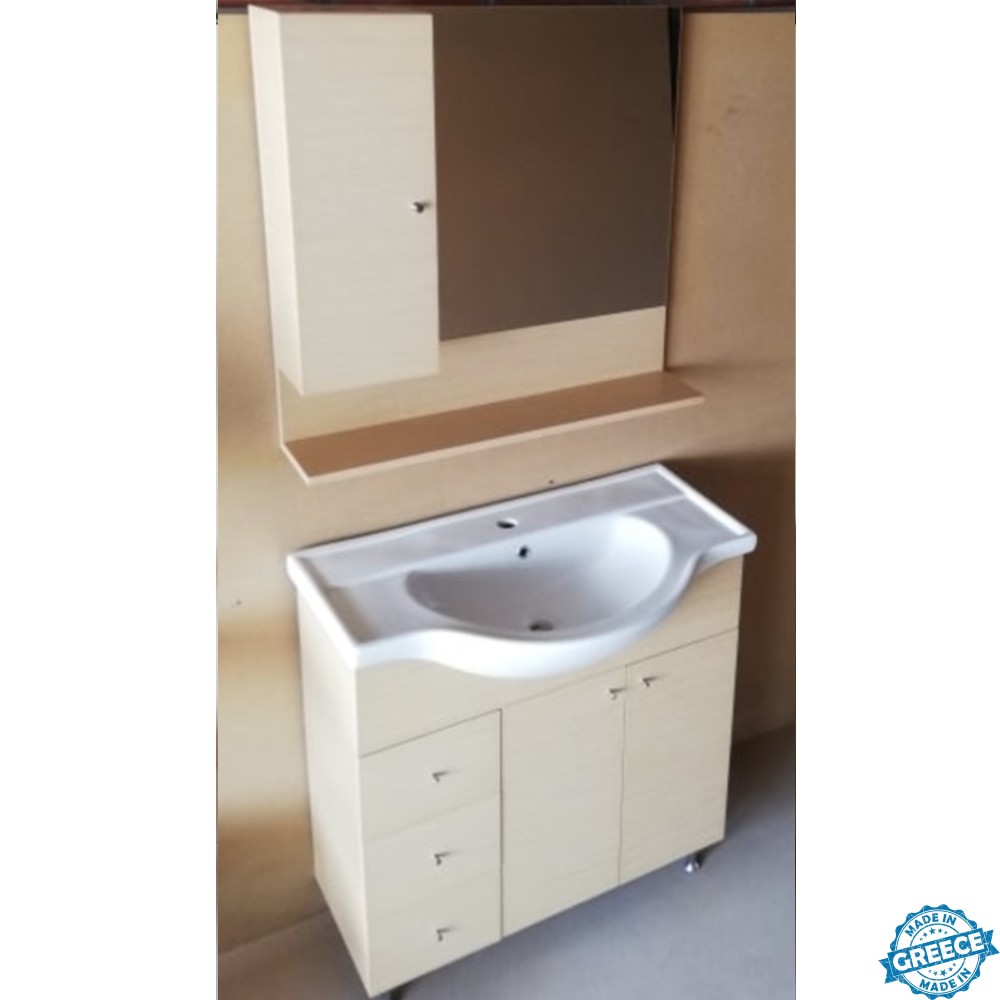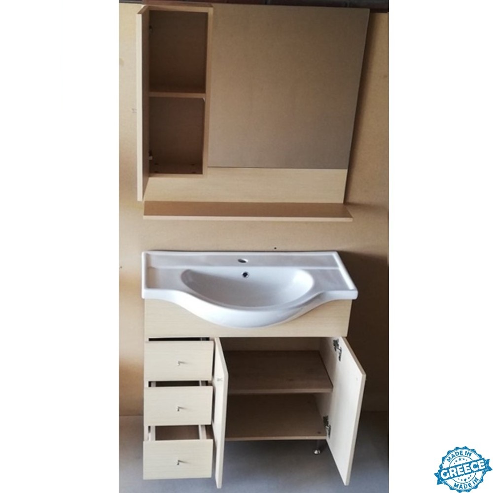 Έπιπλο Μπάνιου Σημύδα 85 σετ mdf με συρτάρια και καθρέπτη ελληνικής κατασκευής ιδανικό για μεγάλα μπάνια με πολύ χώρο αποθήκευσης