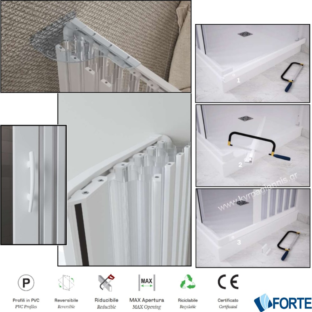 – Αφαιρώντας φύλλα και κόβοντας τον οδηγό-προφίλ πάνω και κάτω μπορεί να προσαρμοστεί και σε μικρότερες γωνιακές μπανιέρες με κυκλική κοιλιά πάντα