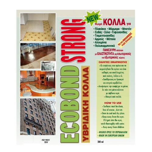 Η κόλλα υβριδική Ecobond Strong 280ml είναι μια υβριδική κόλλα με βάση ρητίνες τροποποιημένου σιλανίου κατάλληλη για συγκόλληση και σφράγιση. Έχει υψηλή πρόσφυγη κατάλληλη για την συγκόλληση XPS, EPDM, PVC, HDPE, πολυκαρμπονικών, ασφαλτικές μεμβράνες, αλουμινίου, στεγανωτικά τσιμεντοειδούς βάσεως, ασφαλτικές μεμβράνες, γυαλιού, καθρέπτου, μετάλλων, σκυροδέματος, γυψοσανίδων, τα περισσότερα πλαστικά που έρχονται σε επαφή με ξύλα και μονωτικά πάνελς.