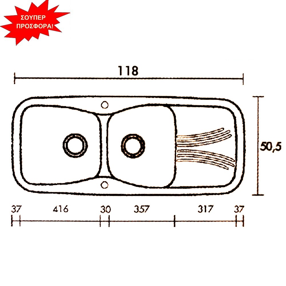 Διάσταση νεροχύτη εξωτερικά : 118 cm x 50,5 cm