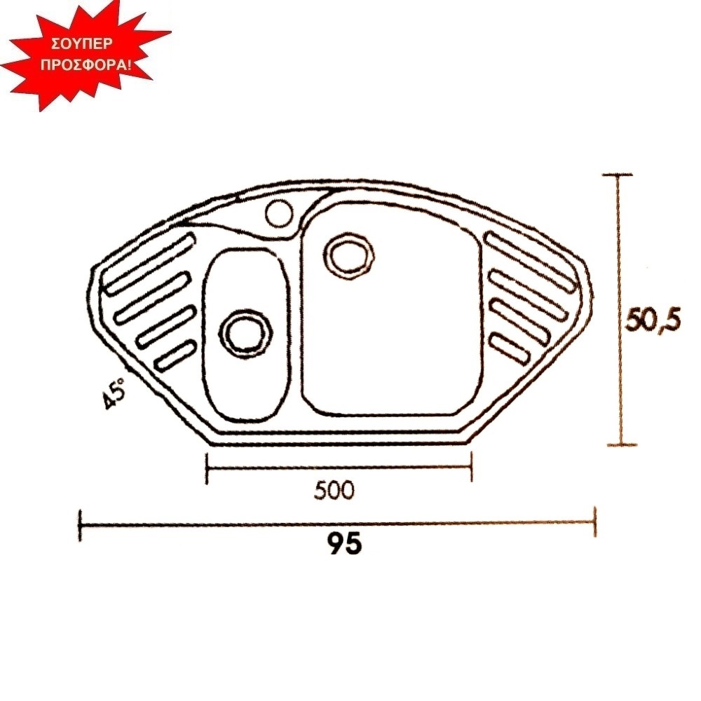 Διάσταση νεροχύτη εξωτερικά : 95cm x 50,5 cm