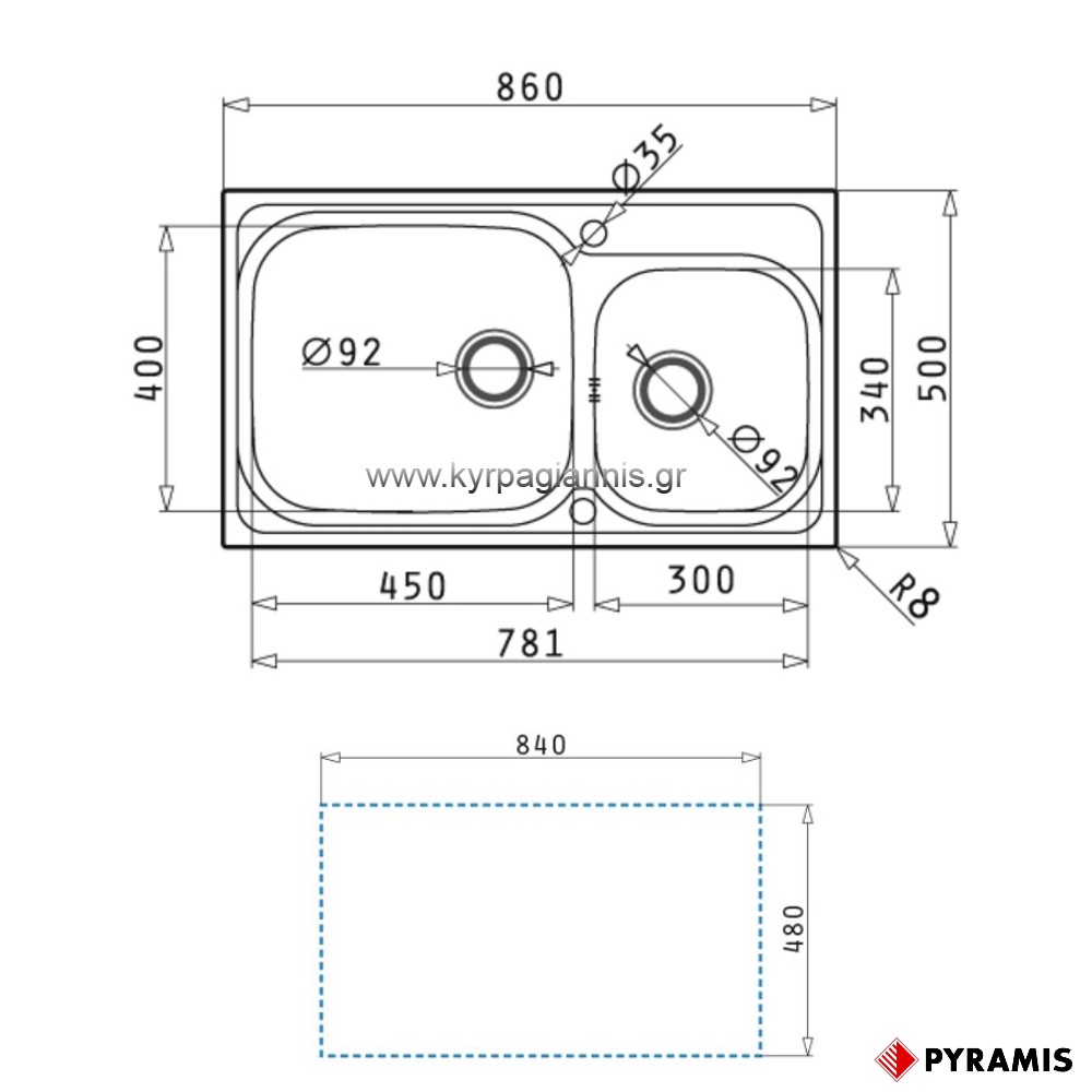Διαστάσεις νεροχύτη : 86 x 50 cm