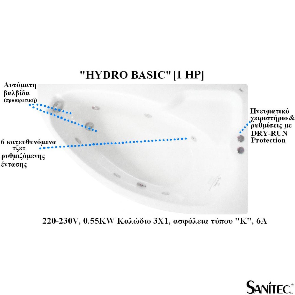 4) Αντλία 1,06 HP (800 Watt), με αισθητήρα ανίχνευσης νερού & σύστημα έναρξης υδρομασάζ μόνο με προκαθορισμένη ποσότητα νερού στην μπανιέρα, για λόγους ασφαλείας