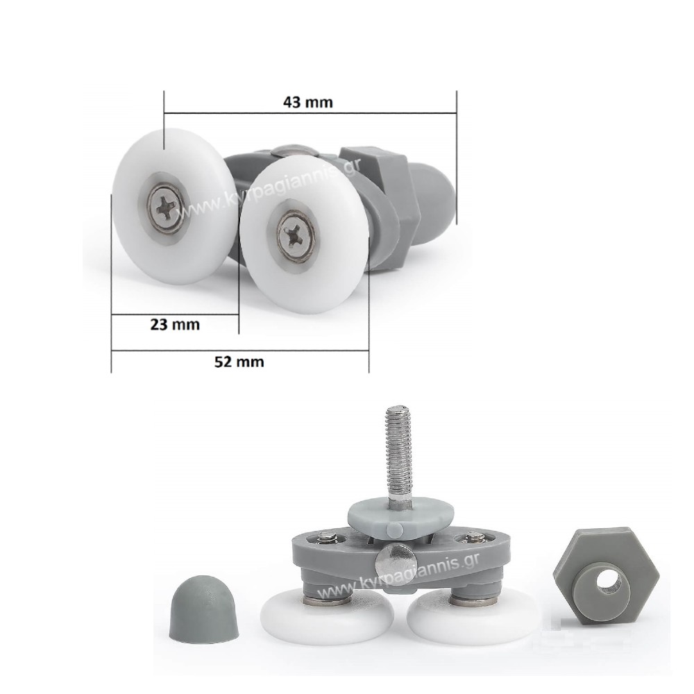 Το συγκεκριμένο διπλό ροδάκι σε ευθεία συνήθως τοποθετείται το ίδιο και πάνω και κάτω στην ράγα της πόρτας της καμπίνας. Το κρύσταλλο πρέπει να βρίσκεται μεταξύ των 2 πλαστικών κυκλικών μερών του μηχανισμού.