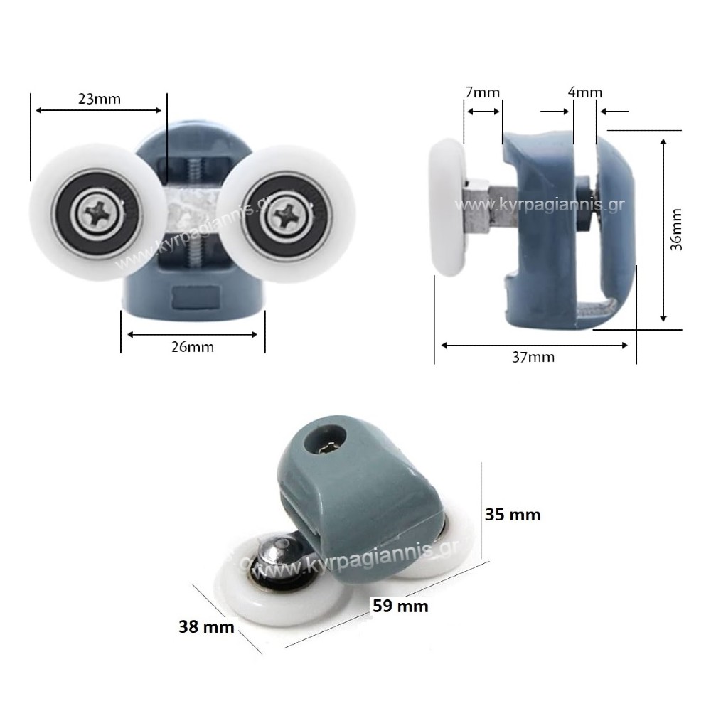 Το συγκεκριμένο διπλό ροδάκι σε ευθεία συνήθως τοποθετείται στο επάνω μέρος της ράγα της πόρτας της καμπίνας και ρυθμίζεται με την βοήθεια της βίδας που έχει στο πίσω μέρος του. Το κρύσταλλο πρέπει να βρίσκεται μεταξύ των 2 πλαστικών μερών του μηχανισμού και συνδιάζεται με το ροδάκι HS058 lower για το κάτω μέρος της πόρτας.